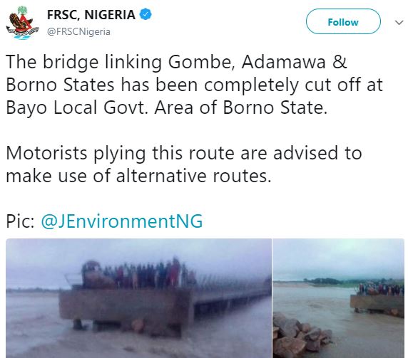 It has been revealed that a bridge linking three states, namely; Gombe, Adamawa & Borno states has been completely cut off after.