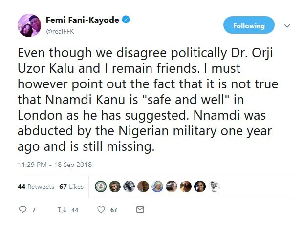 Nnamdi Kanu's Whereabout : Fani Kayode Tackles Orji Uzor Kalu, Reveals Exactly What Happened September 22, 2018 Leave a Reply Read What He Tweeted Below Drop Your comment BelowCopyright © 2018 Master Reporters All Rights Reserved. Tweet Share Share Share Share Tags: MR Biafra
